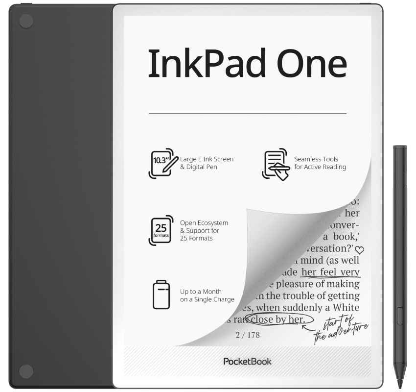 PocketBook představuje InkPad One, novou elektronickou čtečku s 10,3palcovým displejem a stylusem, navrženou pro aktivní čtení a pohodlné psaní rukou. Zařízení je vybavené displejem E Ink Mobius™ připomínajícím papír a dodává se s digitálním perem pro přirozené psaní poznámek, které nabízí spoustu integrovaných nástrojů pro psaní rukou. InkPad One je cenově dostupné řešení s velkým displejem pro čtení, psaní a každodenní použití.